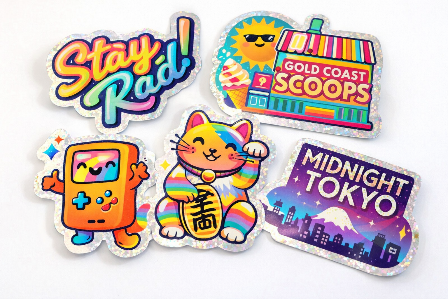 High‑impact glitter vinyl stickers that sparkle from every angle. Printed in the UK on durable, waterproof vinyl, these stickers deliver a bold, shimmering finish that elevates any design. Perfect for branding, packaging, events, and artist merch. Custom sizes from 10 mm to 1300 mm.